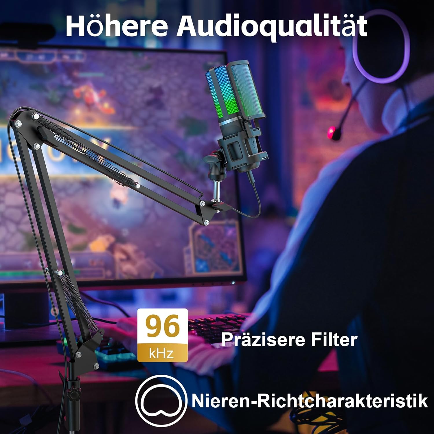 - 【Gradient RGB-Beleuchtung】Dieses USB-Gaming-Mikrofon für PC, Mac und Handy bietet zyklische, gradientenförmige RGB-Lichteffekte mit dynamischen Farben. Die anpassbare RGB-Beleuchtung schafft eine fesselnde Atmosphäre für Gaming, Live-Streaming,