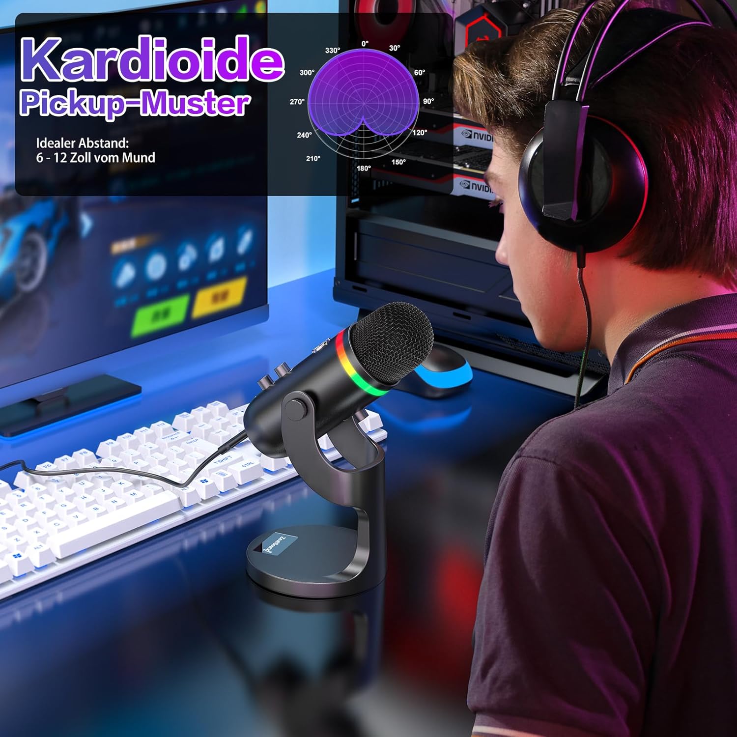 - 【Dynamische RGB-Beleuchtung – Stilvolles Streaming-Setup】Das RGB Gaming Mikrofonverleiht jedem Setup ein professionelles Aussehen. Wählen Sie aus 7 Beleuchtungsmodi – von kräftigen Farben bis zu fliessenden Farbverläufen – passend zu Ihrer
