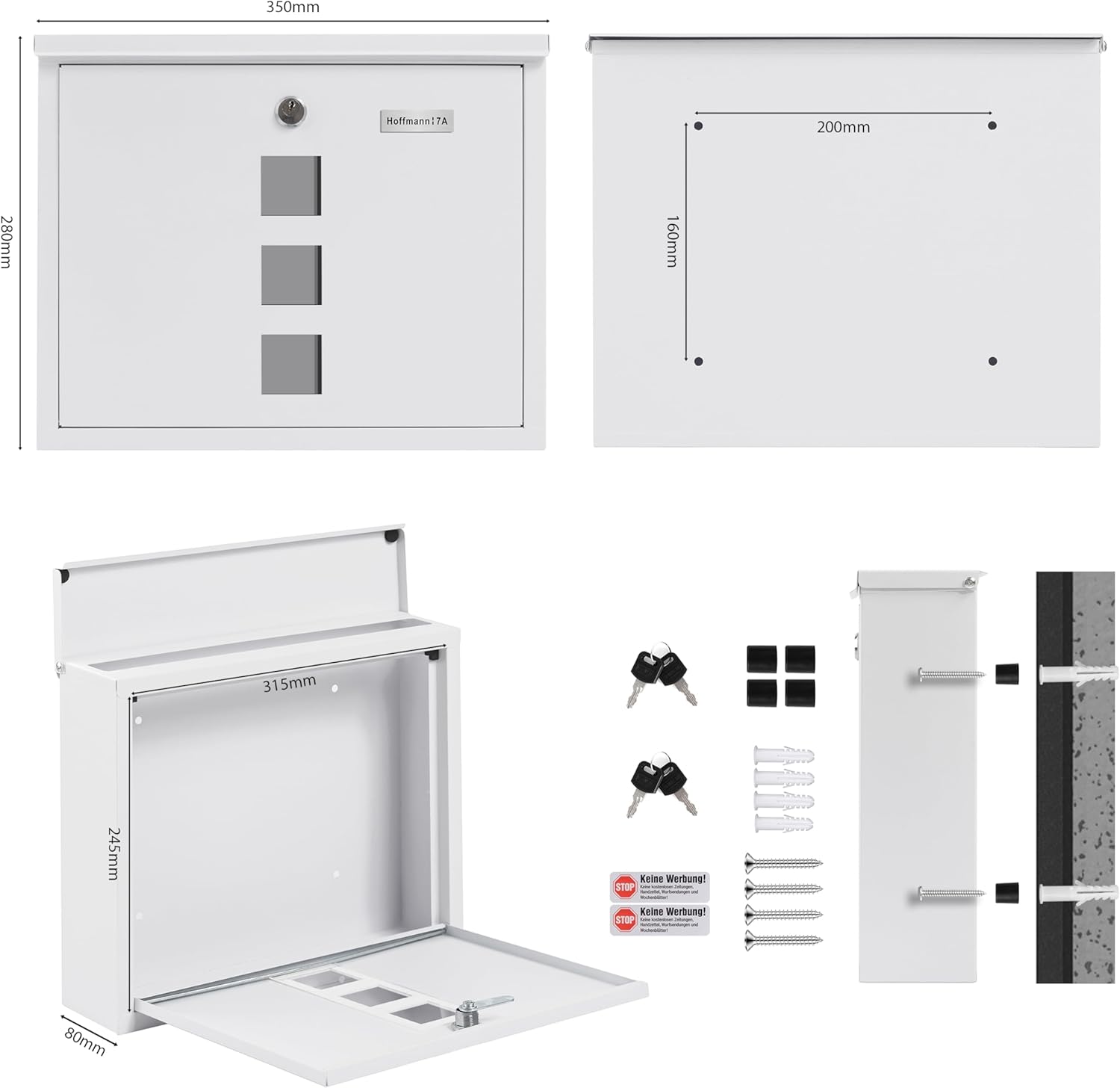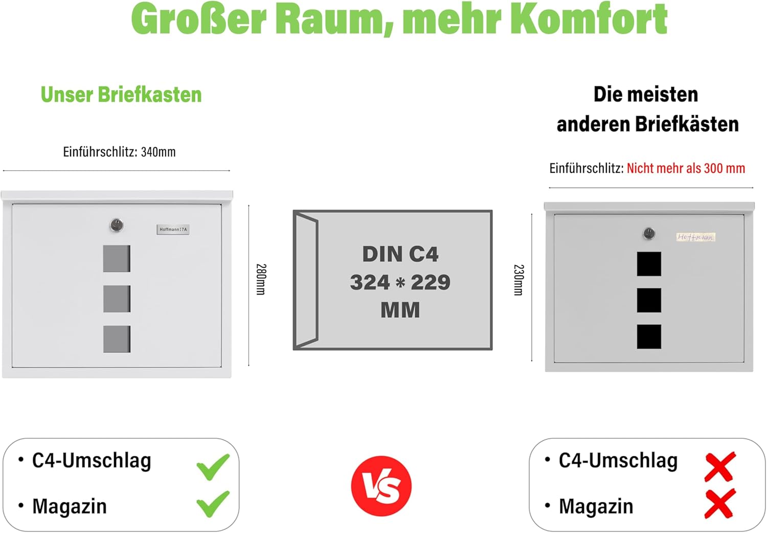 • 【Large Size Design】Masse des Briefkastens: 9.5 x 35 x 28 cm, Briefschlitz: 3,0 x 33 cm. Bietet Platz für Briefumschläge bis C4 und erleichtert den Zugang zu Briefen. Briefe können jederzeit ordnungsgemäss empfangen und aufbewahrt werden, ohne