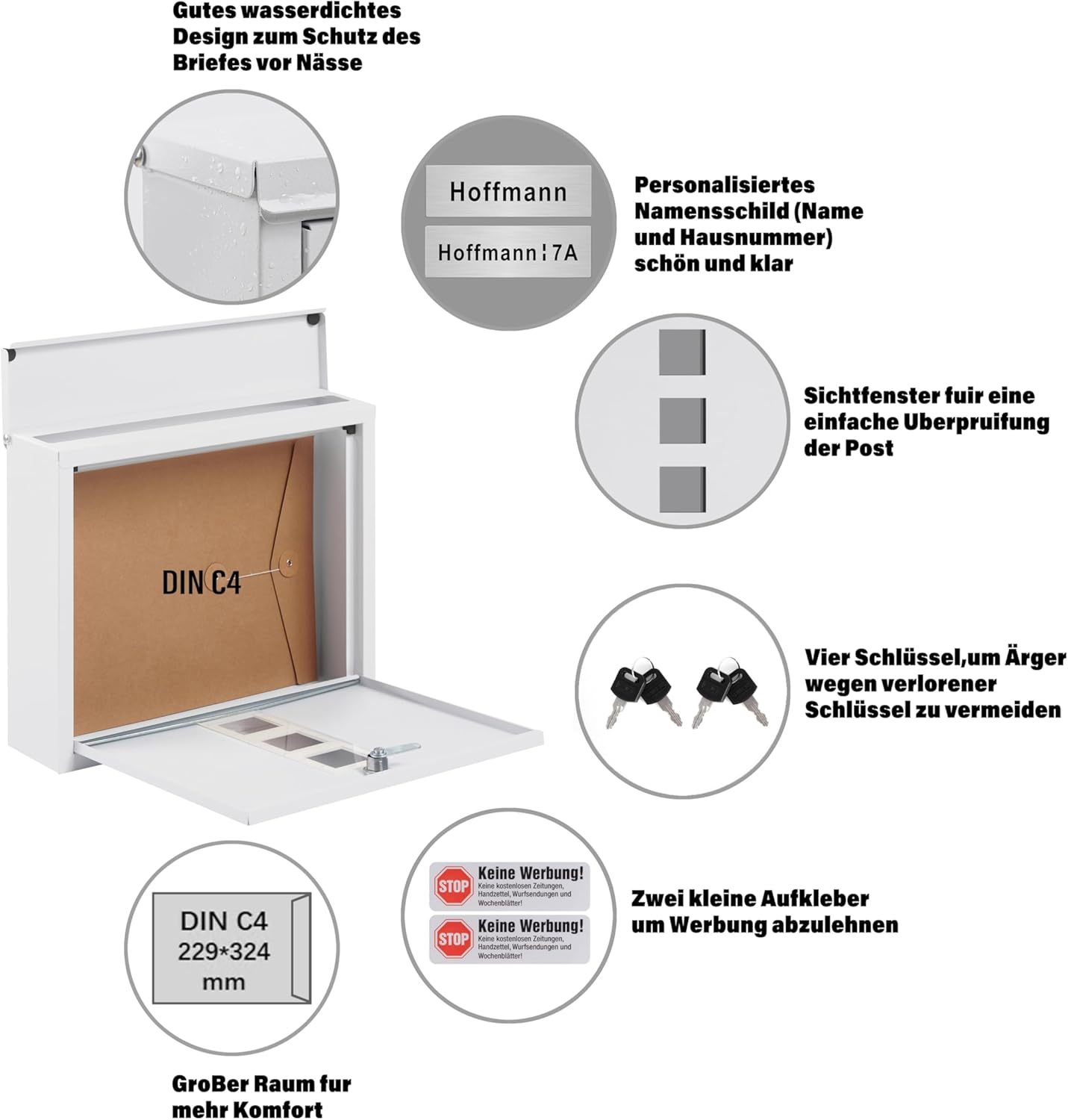 • 【Sichtfenster und Schloss】Das Sichtfenster aus Acrylglas erlaubt einen kleinen Einblick in den Wandbriefkasten und Sie sehen sofort, ob neue Post eingetroffen ist.Ausgestattet mit einem hochwertigen Schloss mit 4 Schlüsseln, um Ihre Post sicher für