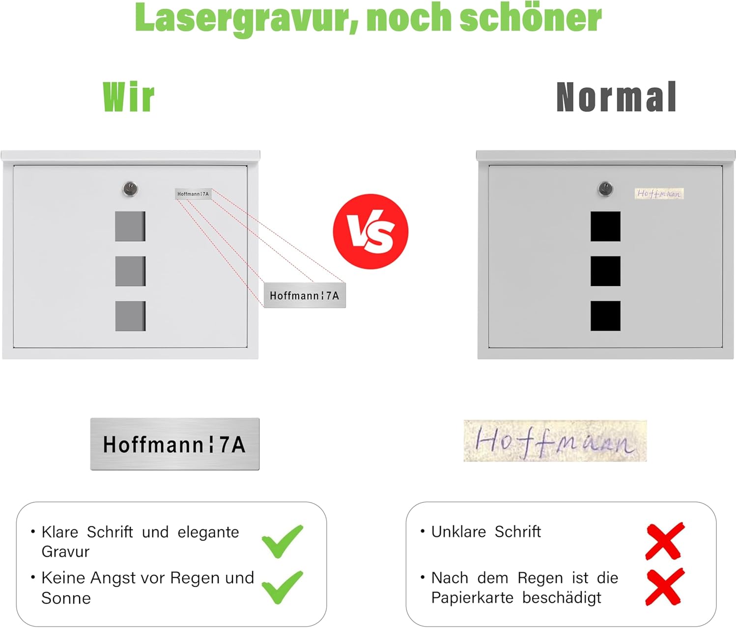 • 【Mit/ohne Namensschild】Sie können wählen, ob Sie das Namensschild personalisieren möchten oder nicht.Wir bieten Ihnen professionelle Namensschilder aus Edelstahl mit einer speziellen Lasergravur Ihres Namens und Ihrer Hausnummer. Die Gravur ist