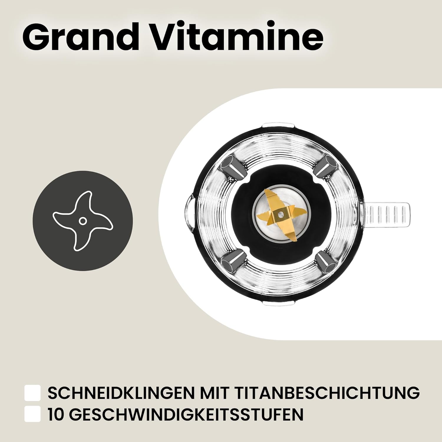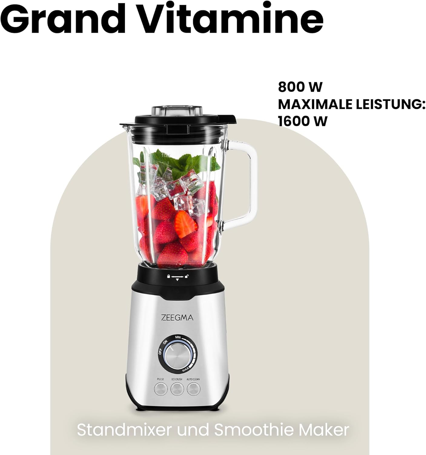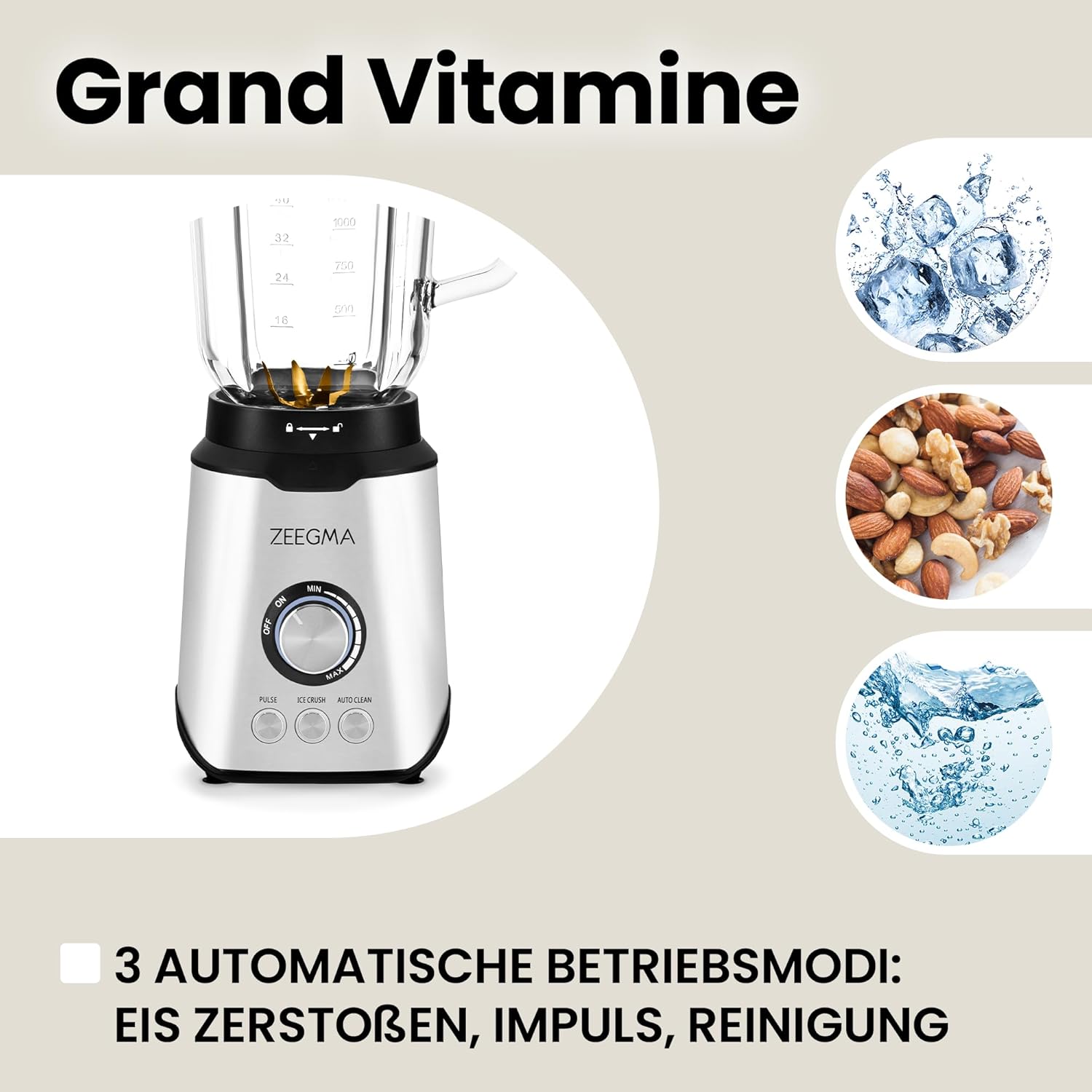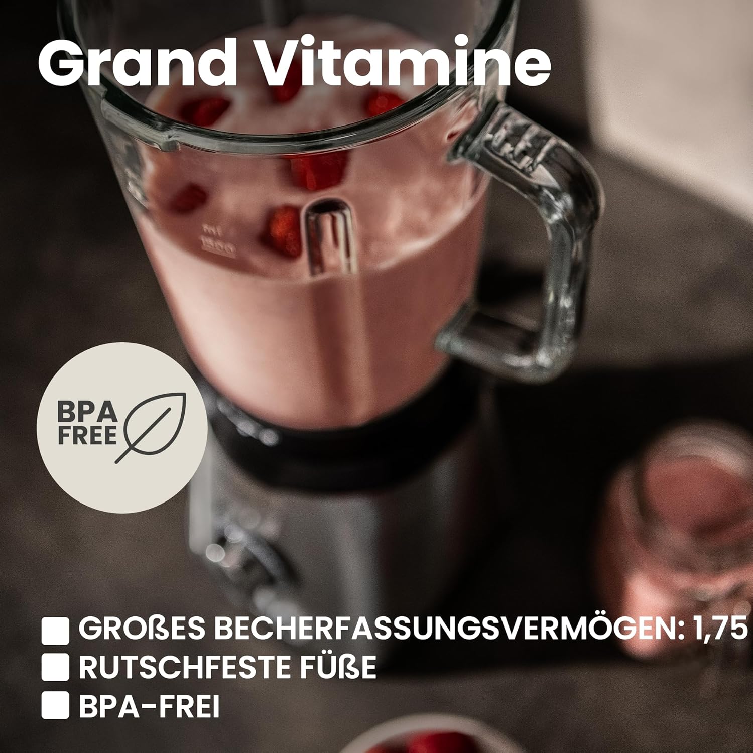- DREI ARBEITSSTUFEN: Neben der sanften Geschwindigkeitsänderung während des Mixens verfügt Grand Vitamine auch über 3 automatische Modi: Pulsmodus, der perfekt zum Mahlen härterer Produkte ist, Eiszerkleinerungsmodus und automatische