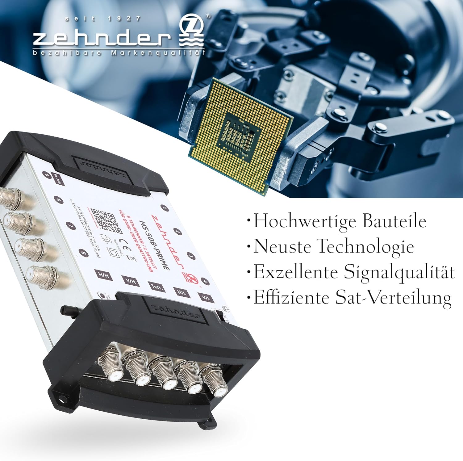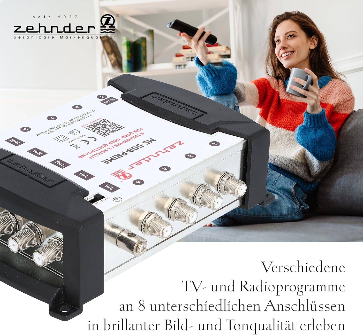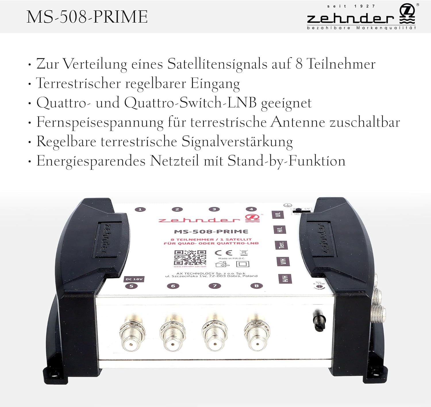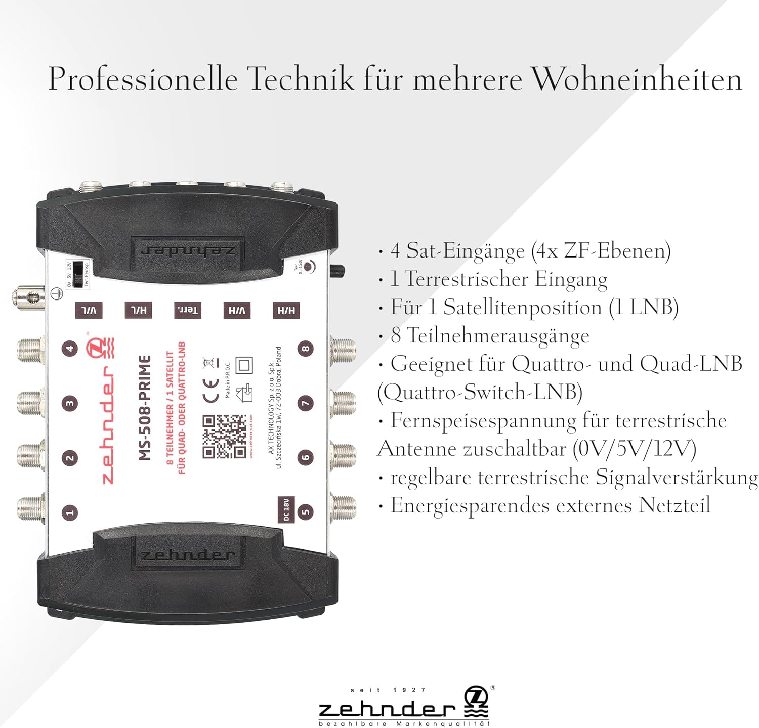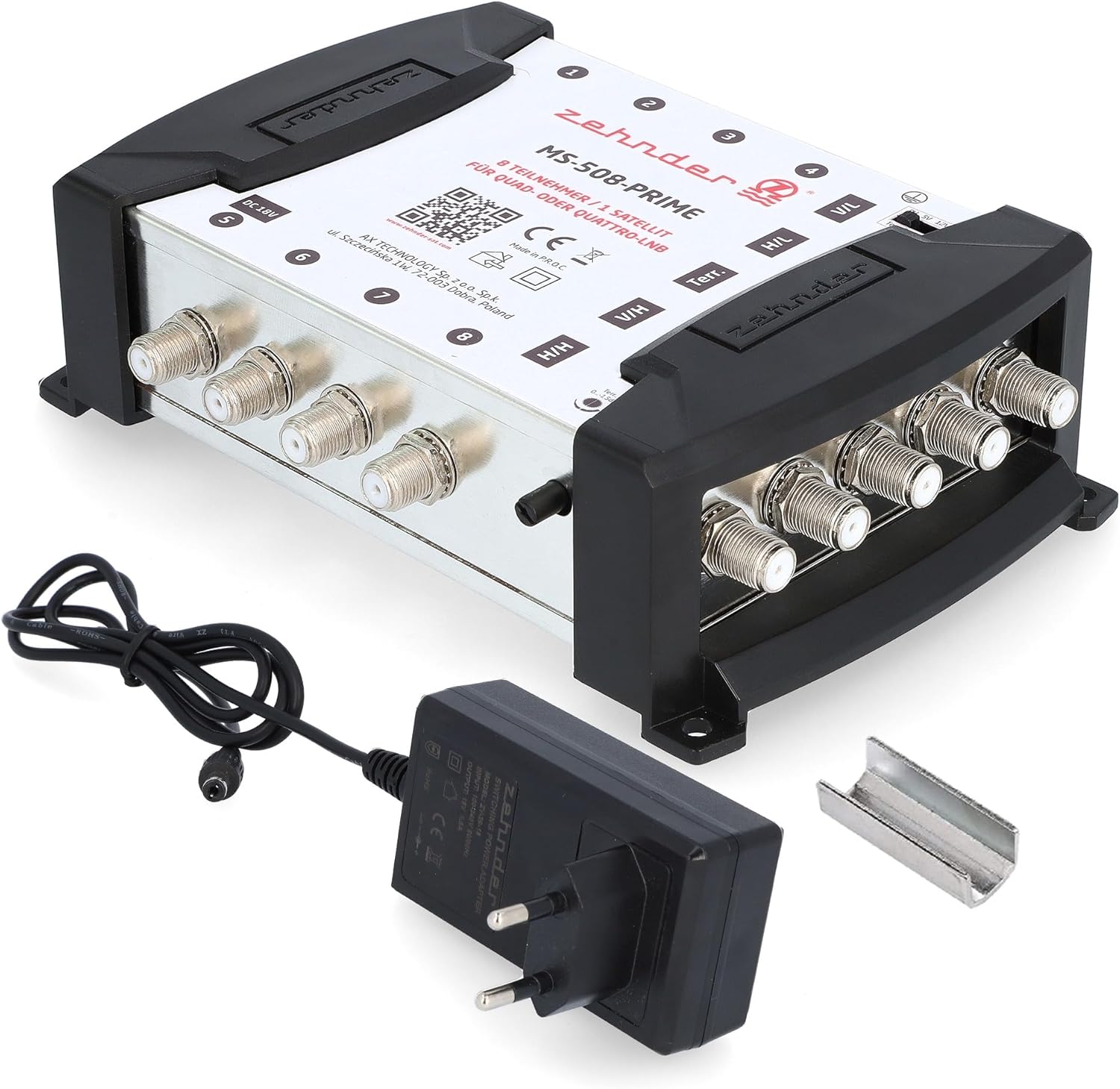 - LIEFERUMFANG - 1x Zehnder MS 508 PRIME Multischalter, 1x externes 18V Netzteil, 1x Bedienungsanleitung, 1x Aufbewahrungsbox, 1x F-Stecker-Aufdrehhife (Werkzeug)