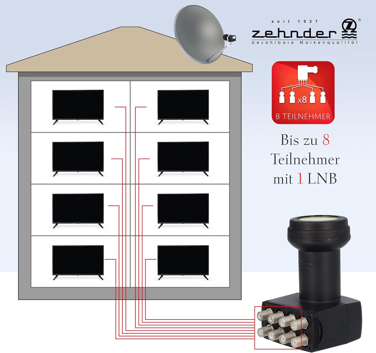 • 8 TEILNEHMER - Zehnder Octo LNB für 8 Teilnehmer und 8 SAT Receiver geeignet. Der LNB kann ohne zusätzlichen Multischalter genutzt werden