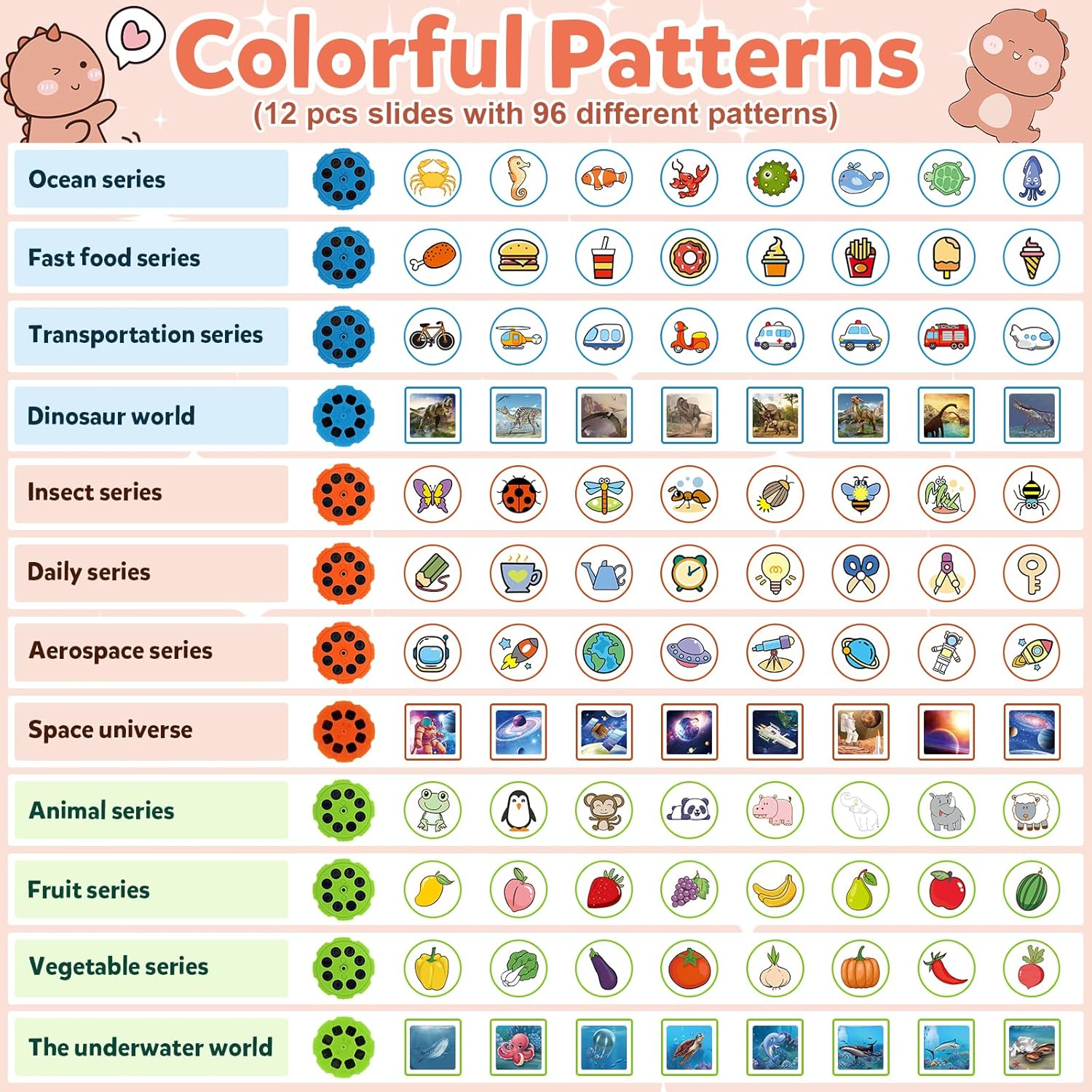 - 【Weitere Picture Discs】Trace and Draw Projektor Spielzeug kommen mit 12 Dias, (Obst, Gemüse, Lebensmittel, Tiere, Dinosaurier, Ozean, Verkehr und etc.), 96 verschiedene Muster. Kinder können wechseln, wie sie möchten und in sie eintauchen, lernen