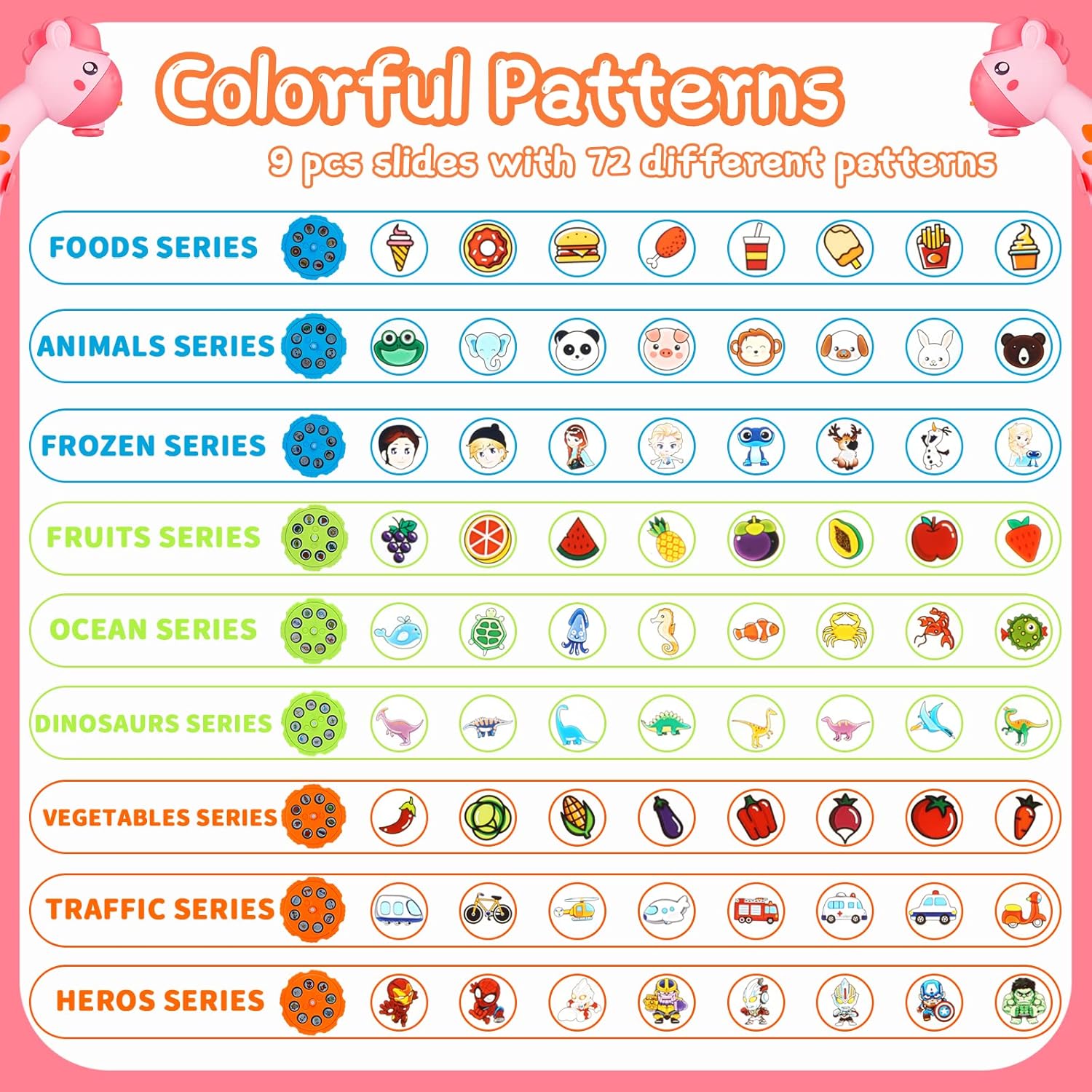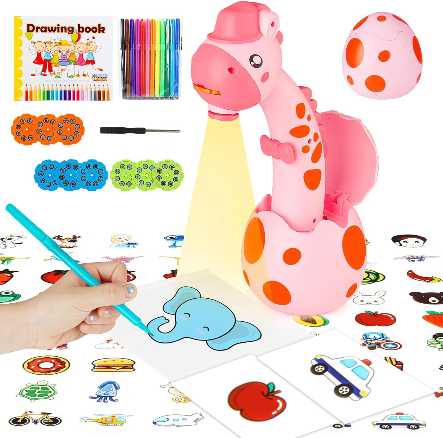 - 【Weitere Bild Discs】 Trace and Draw Projector Toy wird mit 9 Dias (Früchte, Gemüse, Lebensmittel, Tiere, Helden, Gefrorenes, Dinosaurier, Ozean, Verkehr) und 72 verschiedenen Mustern geliefert. Kinder können nach Belieben wechseln und in sie