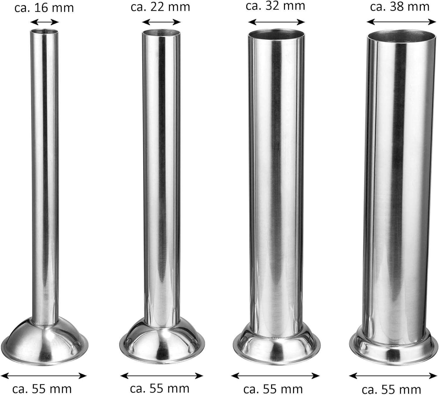 - VIEL ZUBEHÖR I Dem Wurstfüller liegen neben vier verschiedenen Grössen an Füllrohren (16 mm, 22 mm, 32 mm, 38 mm), auch eine Reinigungsbürste und zwei Ersatzdichtungsringe bei.