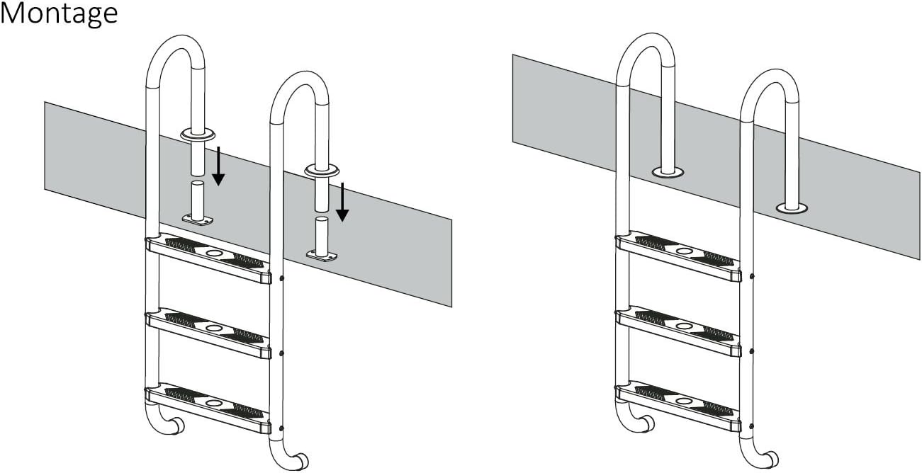- SICHERHEIT | Im Lieferumfang sind Befestigungshülsen enthaltenen, welche eine Montage auf Beton oder anderen Oberflächen ermöglichen. Somit ist die Schwimmbeckenleiter fest verankert und bietet einen sicheren Halt.