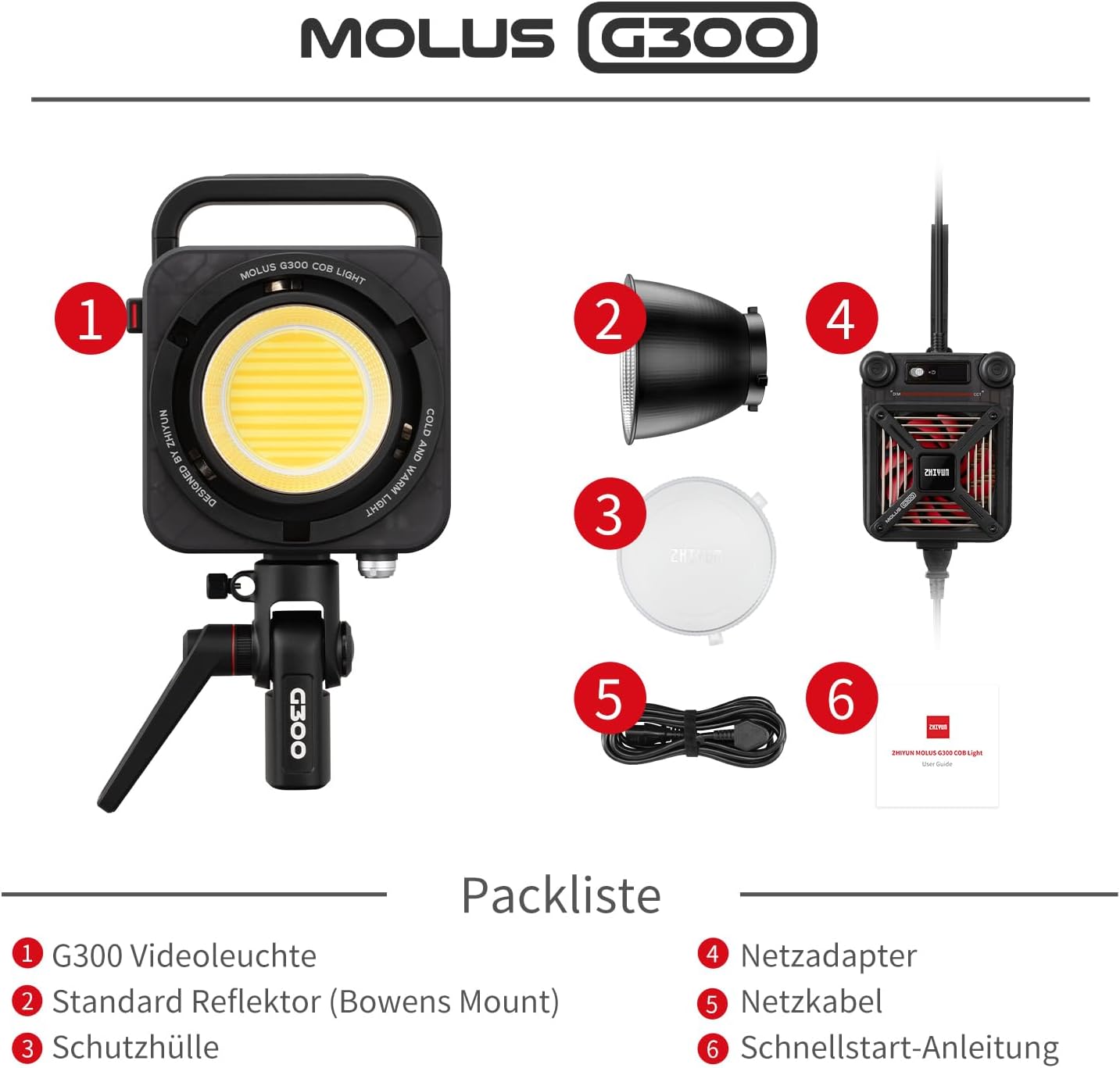 - [ Beleuchten Sie Ihren Weg Anders ] Die ZHIYUN Molus G300 COB Videoleuchte bringt mit ihrer unvergleichlichen professionellen Beleuchtung und mühelosen Steuerung eine neue Ebene der Effizienz in Ihren kreativen Prozess. Das innovative Design der ZHIYUN