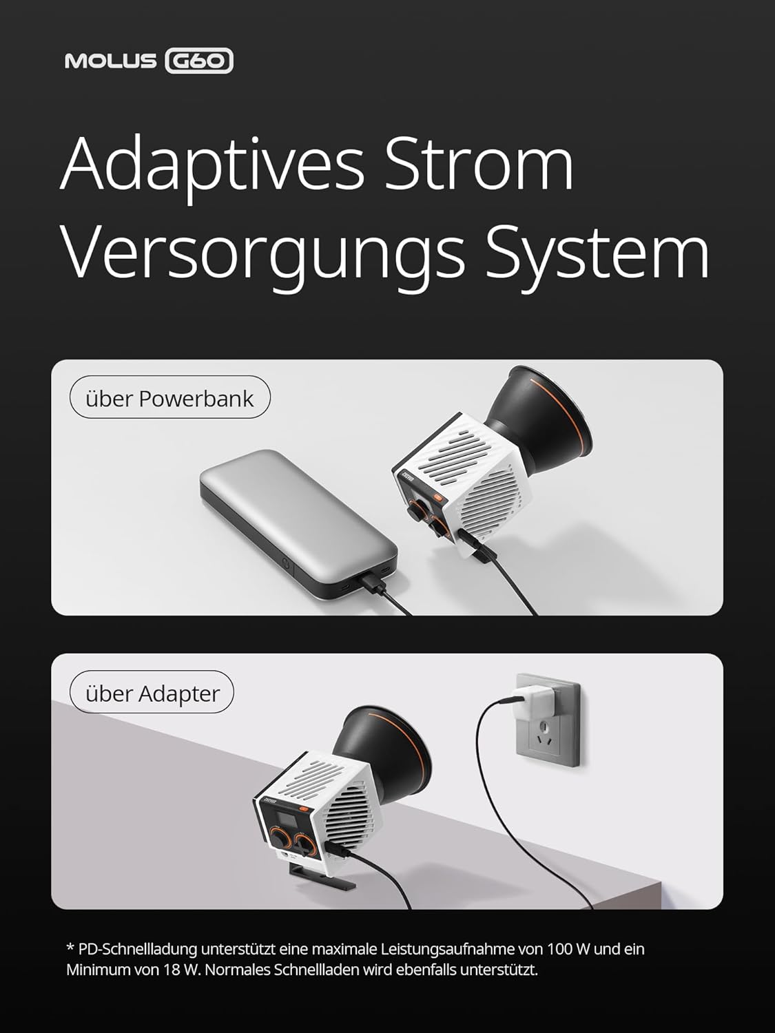 - [ Bequeme Aufbewahrung und Aufladen ] Mit seinem adaptiven integrierten Stromversorgungssystem kann das G60 Videoleuchte schnell über einen Gleichstromadapter oder ein Typ-C-Kabel mit Strom versorgt werden, und seine praktische Aufbewahrung macht es