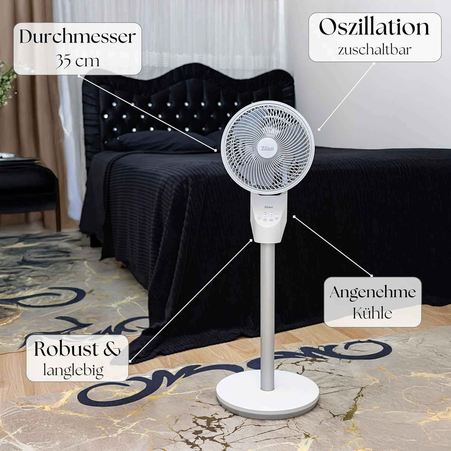 - ◾Leistungsstarker AC-Motor mit 60 Watt◾ Ausgestattet mit einem hochwertigen 60-Watt-Wechselstrommotor, bietet dieser Ventilator eine starke und gleichmässige Luftzirkulation. Der Motor arbeitet effizient und ist für den Dauerbetrieb ausgelegt –