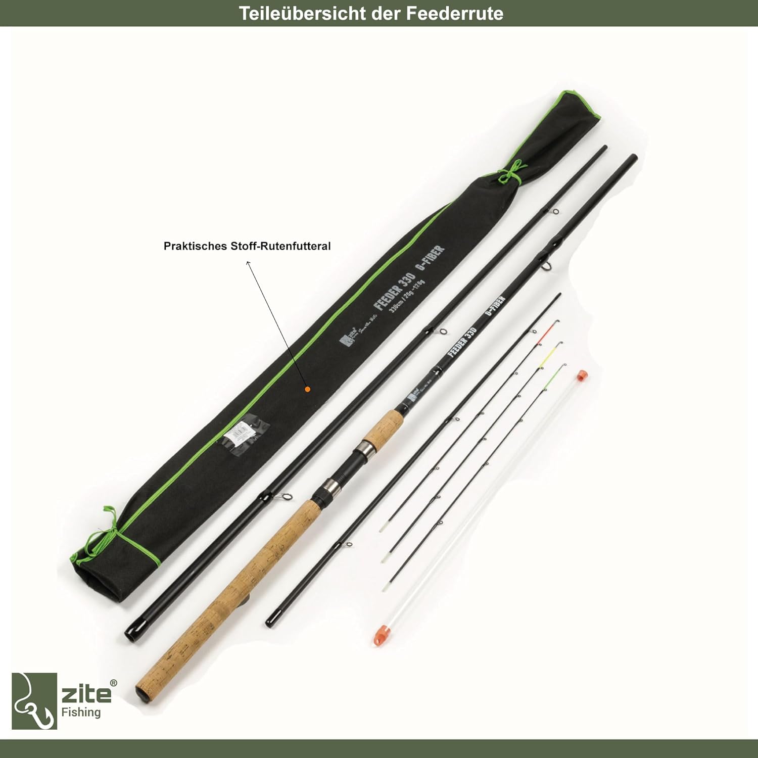 • ROBUSTE EINSTEIGER RUTE: Die Zite Fishing Basis Feeder-Rute ist aus robustem Fiberglas Material gefertigt und hält auch kapitaleren Exemplaren durchaus stand.