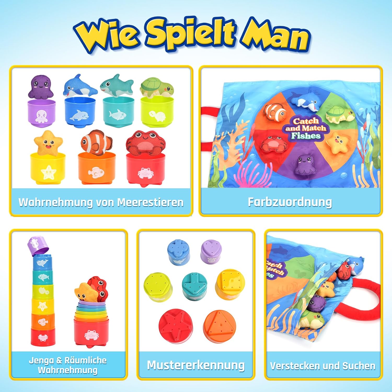 - Motorikspielzeug Zusammensetzung des Spiels: 5-in-1 Angelspielset mit 14 Meerestier-Figuren (inkl. 2 Schildkröten, 2 Clownfische, 2 Haie, 2 Seesterne, 2 Delfine, 2 Kraken und 2 Krebse), 7 stapelbaren Meerestier-Bechern, 2 kindgerechten Angelruten und 1