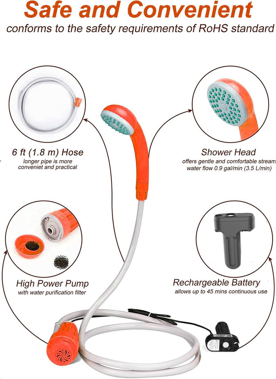 - ▶ COMPACT CAMP SHOWER -Das Kit besteht aus einer leistungsstarken Duschpumpe, einem empfindlichen Duschkopf, einem Saugdeckel, einem S-Haken und dem 1,8-M-Schlauch sowie einem Akku, der für Mobilität und Flexibilität während des Gebrauchs sorgt