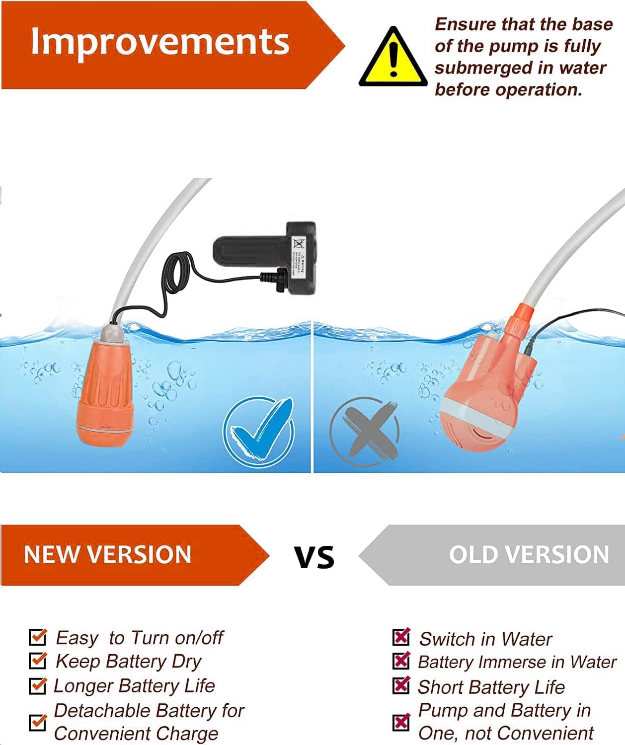 - ▶ Upgraded-Version: Kommen Sie mit Eins abnehmbaren wiederaufladbaren USB-Akkus (2200mAH), die von der Pumpe getrennt sind. Externe Ein / Aus-Funktion, eine Verbesserung gegenüber dem vorherigen Design. Die Batterien müssen nicht in Wasser getaucht
