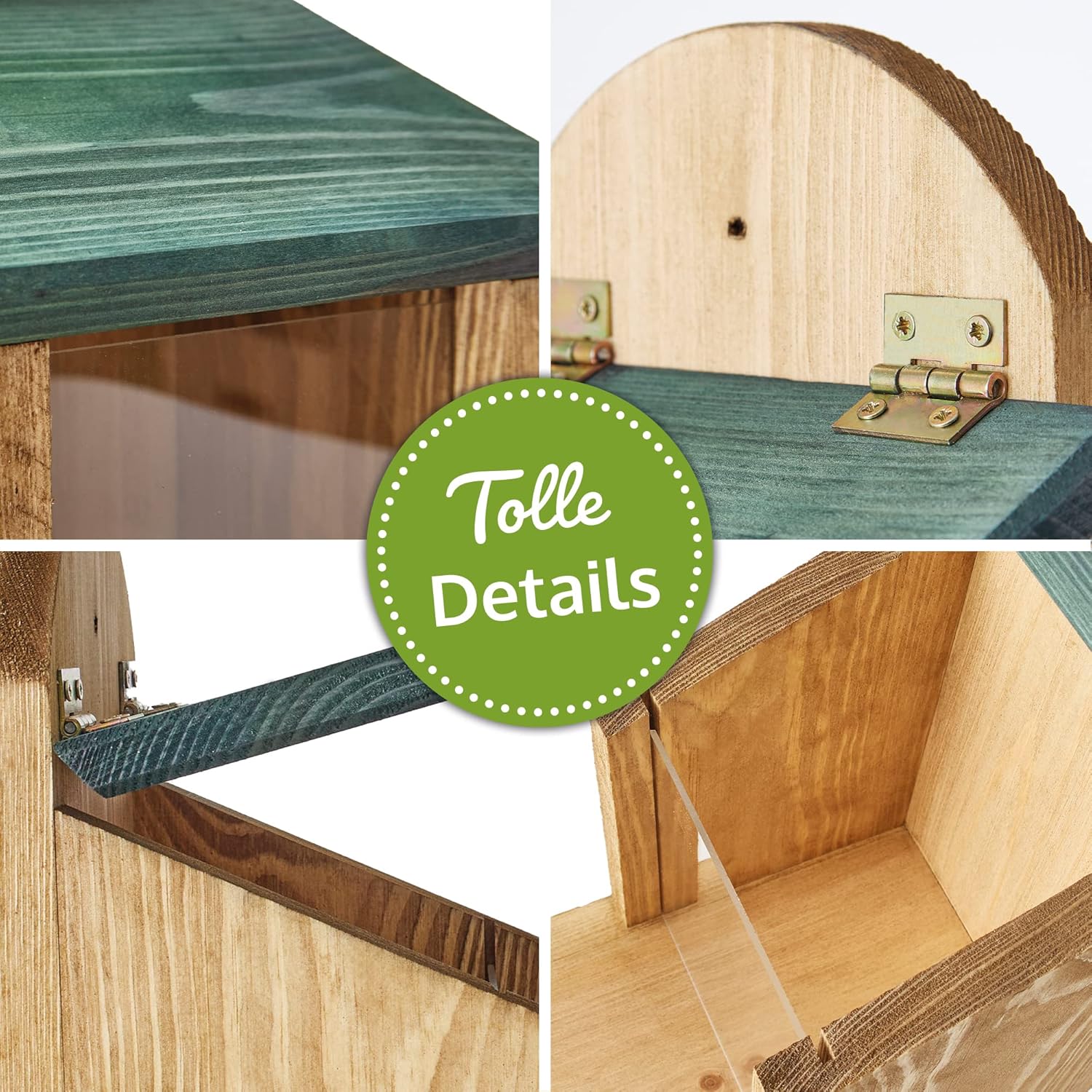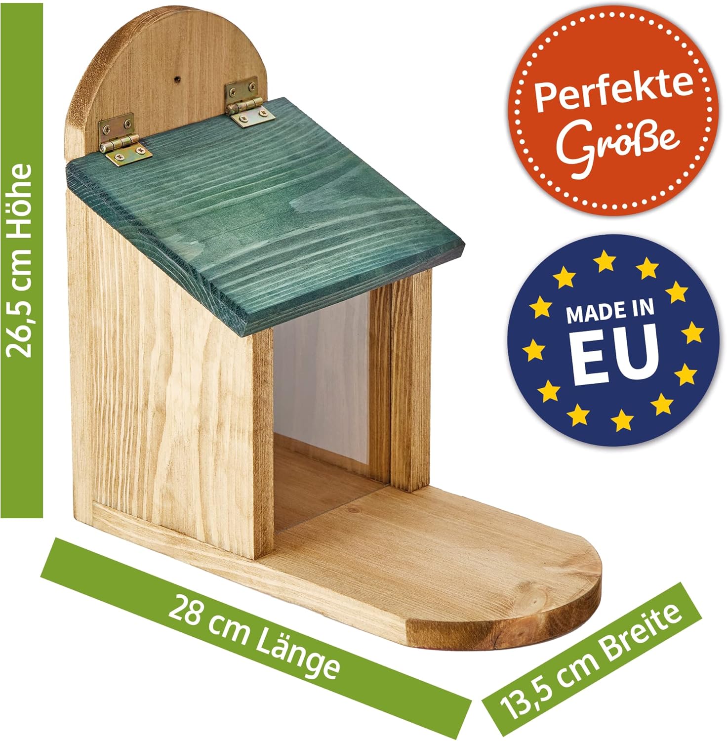 - LEICHT ZU BEFÜLLEN – Öffne das Klappdach und fülle es mit Futter/Eichhörnchenfutter (Nüsse, Walnüsse & Haselnüsse). Die Eichhörnchen Station mit Plexiglasscheibe ist für alle Jahreszeiten geeignet