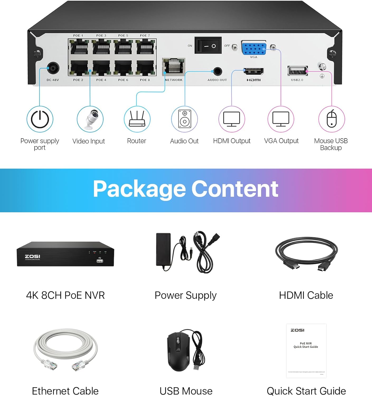 ZOSI 8CH 4K PoE NVR mit 2TB Festplatte, 8MP Videoüberwachung Recorder für 24/7 Aufnahme, Funktionier