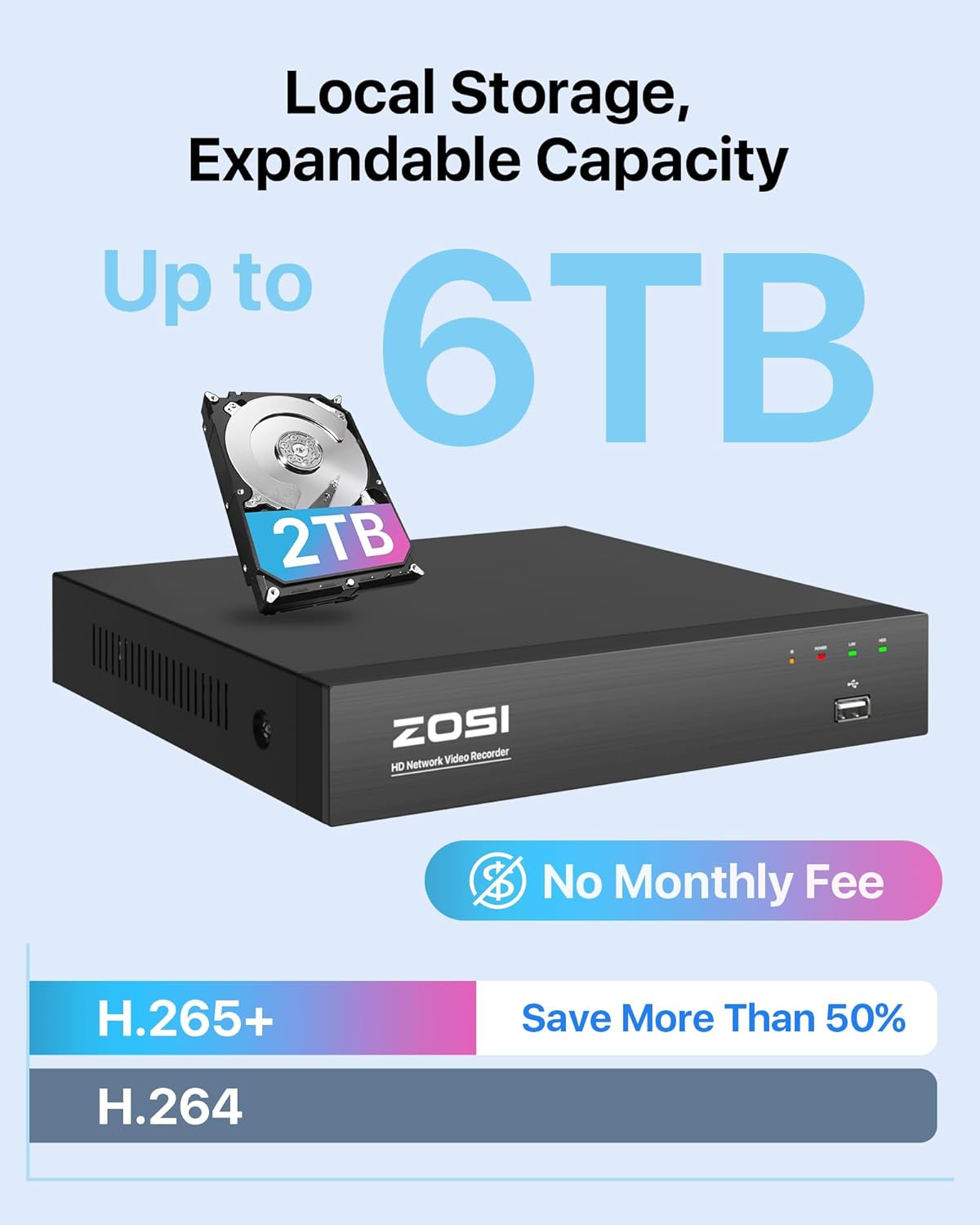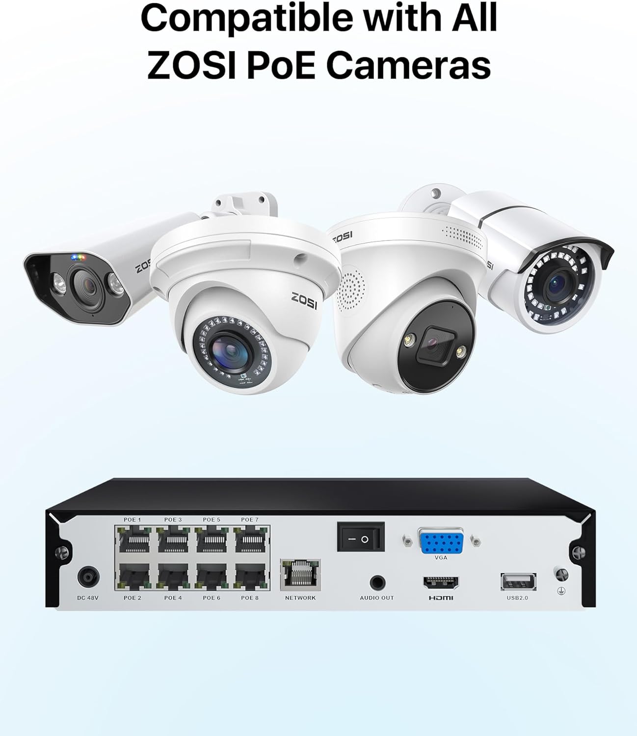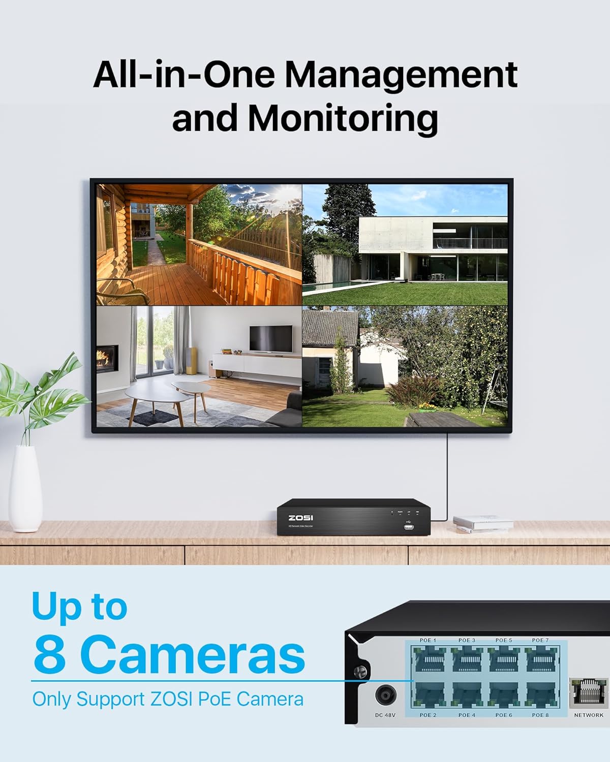 • (1) 8-Kanal-PoE-NVR mit 2 TB HDD: Der 8CH PoE-Rekorder gibt Ihnen die Flexibilität, Ihr eigenes Heimsicherheitssystem mit bis zu 8 Überwachungskameras hinzuzufügen, um grosse Überwachungsbereiche abzudecken. Funktioniert NUR mit ZOSI PoE Kameras: