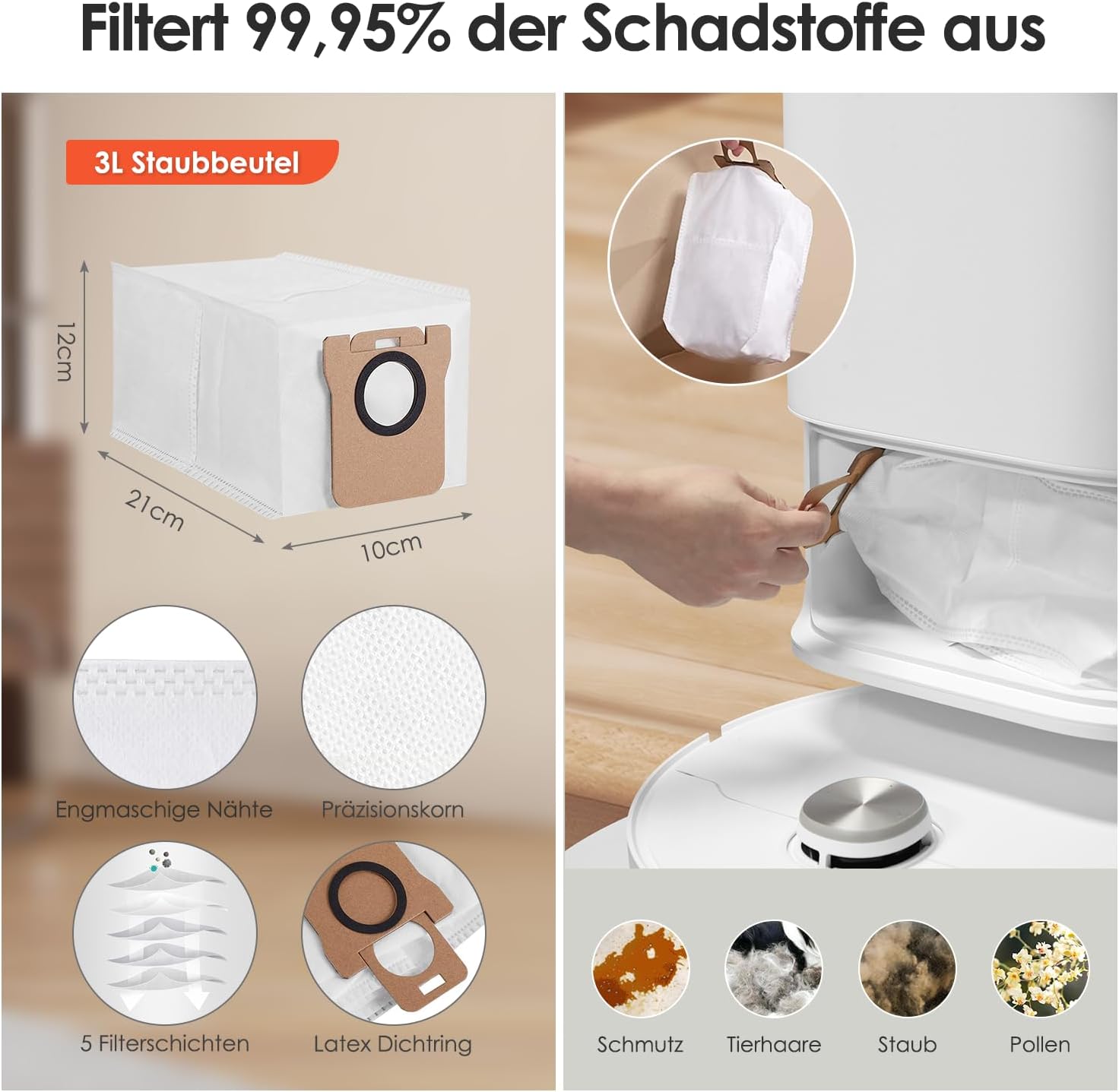- [Staubbeutel] Hergestellt aus hochwertiger Meltblown-Faser-Filterschicht und Vliesstoff, kann es 99.95% der Schadstoffe effektiv herausfiltern. Das grosse Fassungsvermögen fängt Abfall, Haare und Staub auf und sorgt für einen sauberen Boden wie neu.