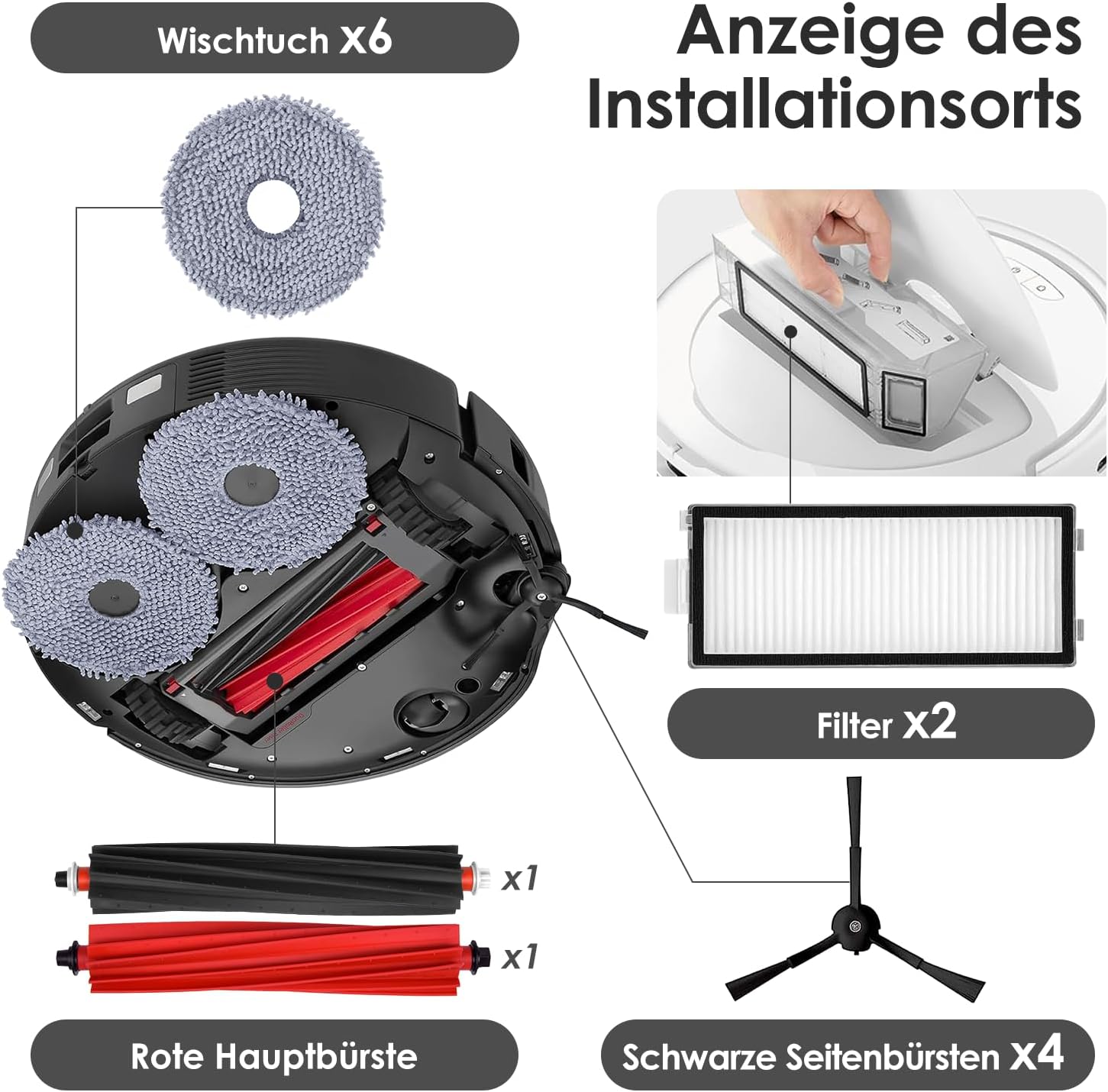 - [Lieferumfang / Anwendung] Nur für Roborock Q Revo Master/Qrevo Slim. Lieferumfang: 4 x Staubbeutel, 1* Hauptbürste, 4* Schwarze Seitenbürsten, 2* Filter, 6* Wischtuch, 1* Reinigungsbürste, 1* Schraubendreher.