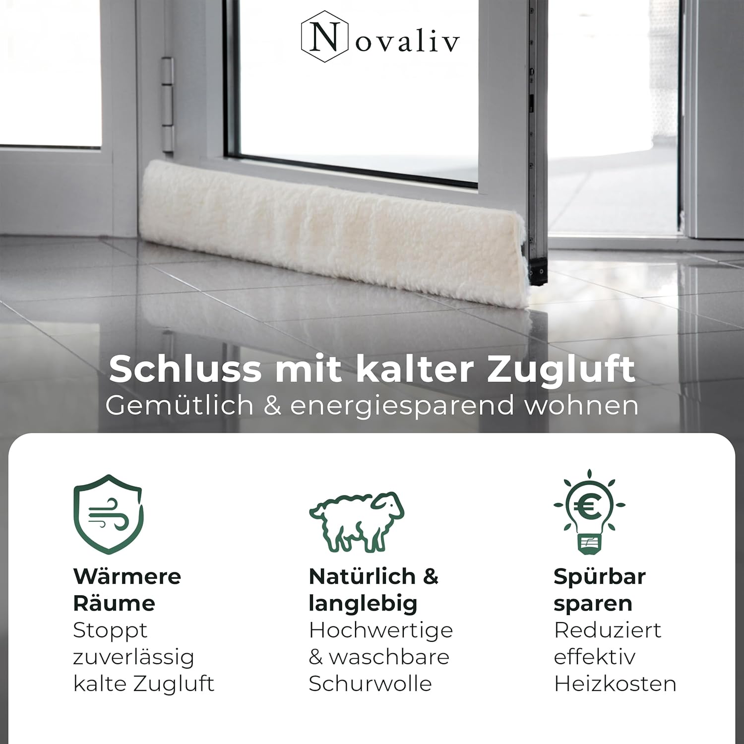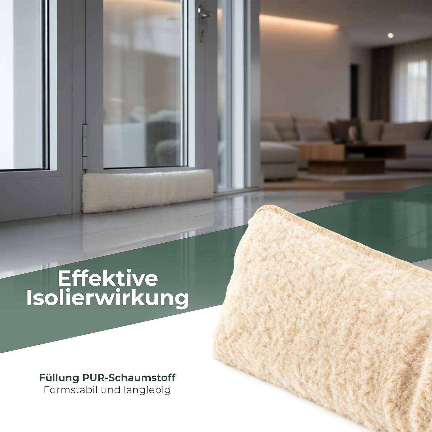 - MATERIAL & FÜLLUNG: Hülle aus Schurwolle – natürlich, isolierend, atmungsaktiv; Füllung PUR-Schaumstoff – formstabil, langlebig. Querschnitt 15×5 cm für dichte Auflage am Türspalt.