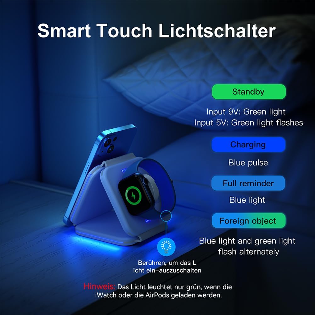 - 【3 IN 1 Magnetic Wireless Charger】Mit unserer kabellosen Ladestation können Sie Ihr iPhone/iWatch/AirPods gleichzeitig aufladen. Ein kleiner Helfer, um Ihren Schreibtisch aufgeräumt zu halten! Und die neu aktualisierte Ladestation nimmt die "kleine