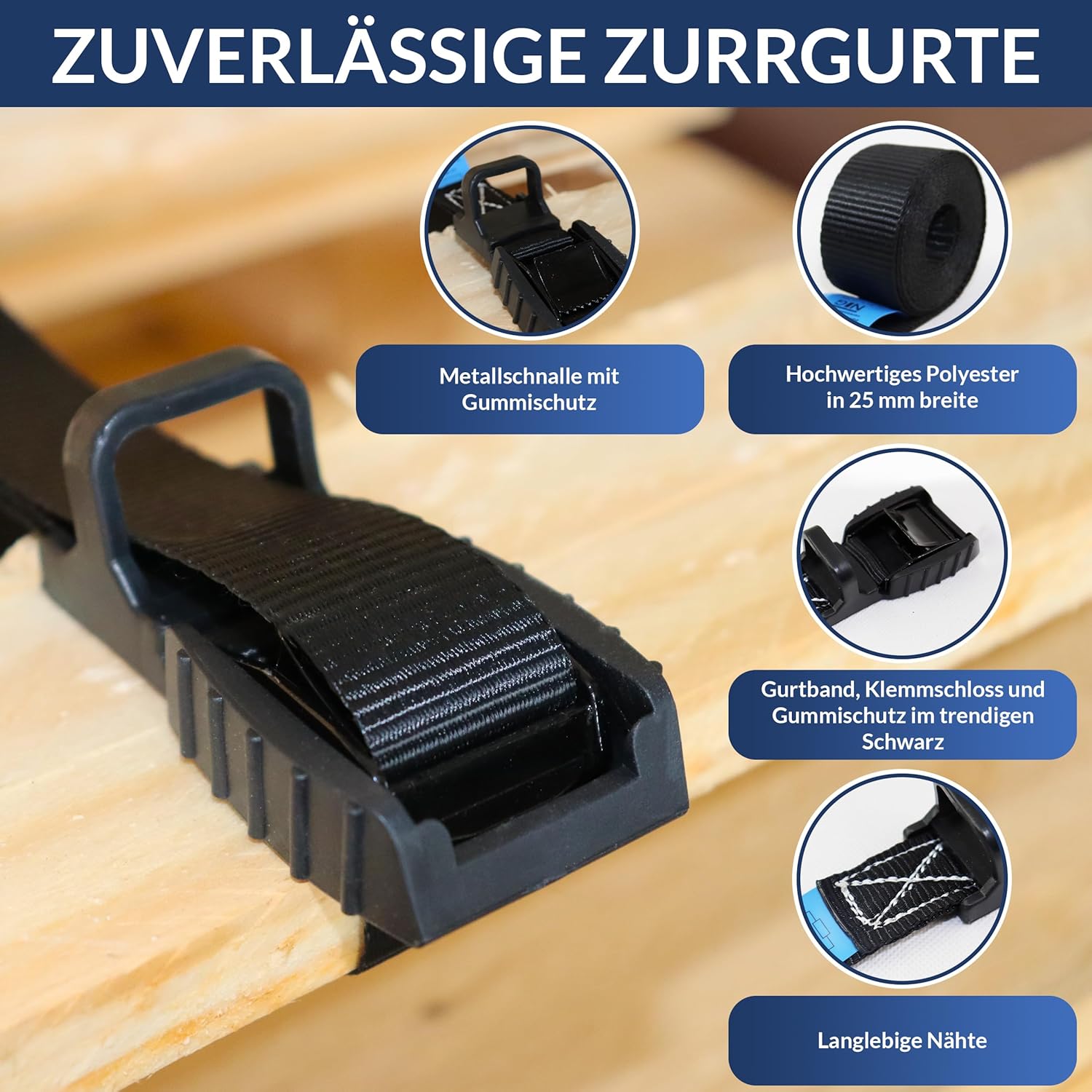 - SICHERHEIT UND STABILITÄT: Die Zurrgurte sind mit einem zuverlässigen Klemmschloss ausgestattet, das eine sichere Befestigung gewährleistet, um Ihre Ladung während des Transports zu sichern.