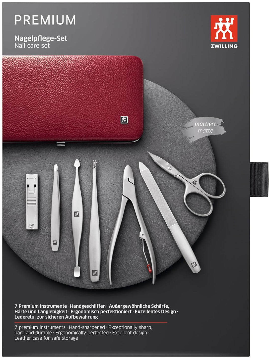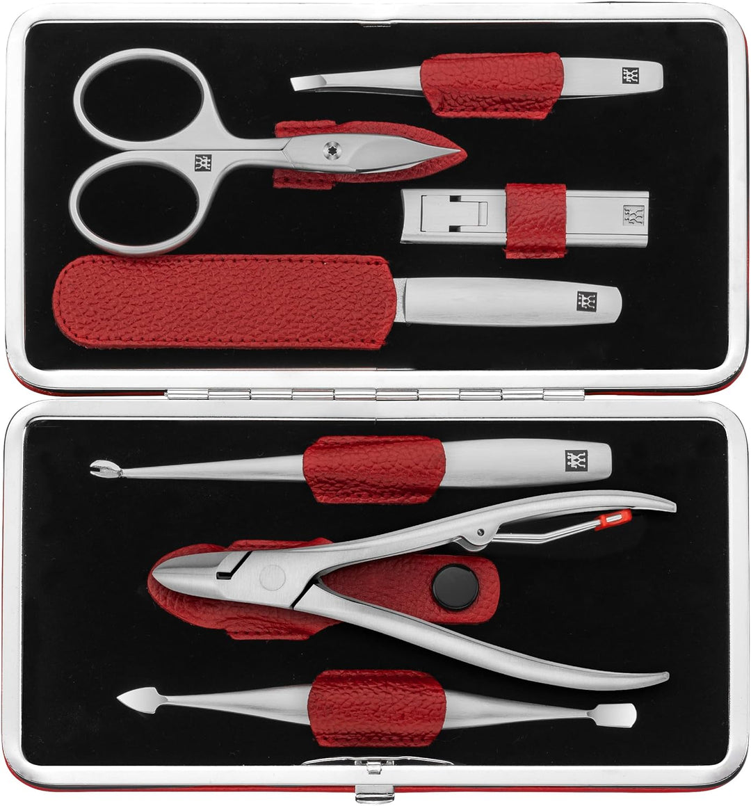 - Lieferumfang: Bestehend aus 2-in-1 Kombi-Nagelschere, TWIN S Nagelknipser, Nagelzange, Saphir-Nagelfeile, Nagelhautmesser, 2-in-1 Maniküre-Instrument und schräger Pinzette