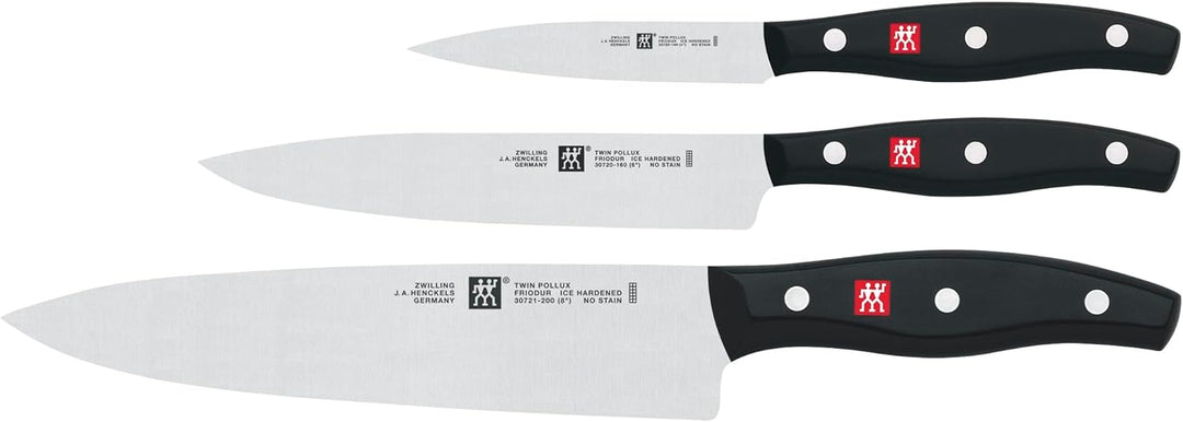- Lieferumfang: 1x ZWILLING Messer-Set, 3-tlg., Twin Pollux, 1x Spick- /Garniermesser (10 cm/46 g), 1x Fleischmesser (16 cm/79 g), 1x Multifunktionales Kochmesser (20,1 cm/196 g), Material: Spezialstahl/Kunststoff-Griff, 30763-000-0