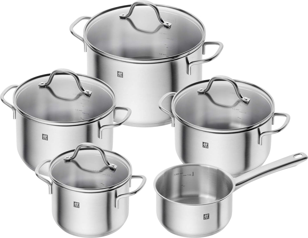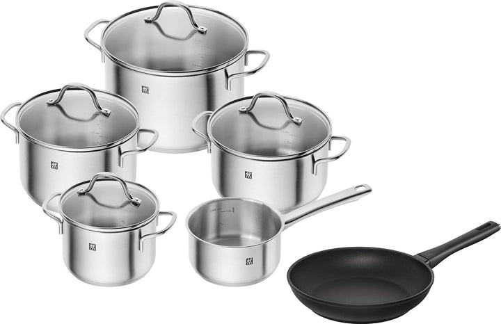 - Lieferumfang: 1x ZWILLING Kochtopf-Set + Pfanne, 6-tlg., Flow Topfset: 3x Kochtopf + Deckel (Ø 16 cm/1,8 L, Ø 20 cm/4 L, Ø 24 cm/6 L), 1x Bratentopf + Deckel (Ø 20 cm/3 L), 1x Stieltopf (Ø 16 cm/1,5 L), Material: Edelstahl 18/10, 71030-000-0, Madura