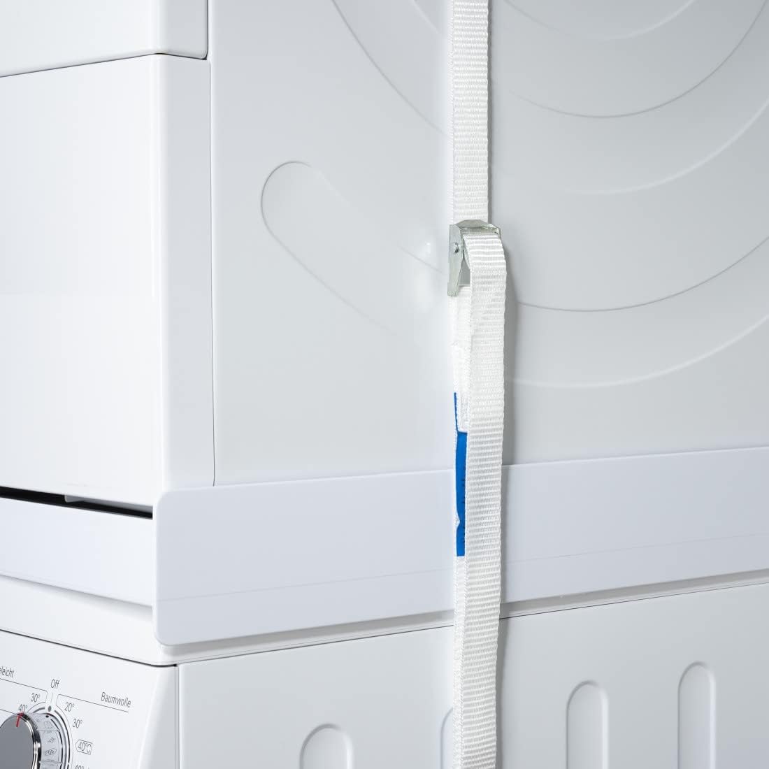 - Platzersparnis durch Zwischenrahmen: Wäschetrockner auf die Waschmaschine stellen spart Platz im Bad und ist dank des Spanngurts sicher