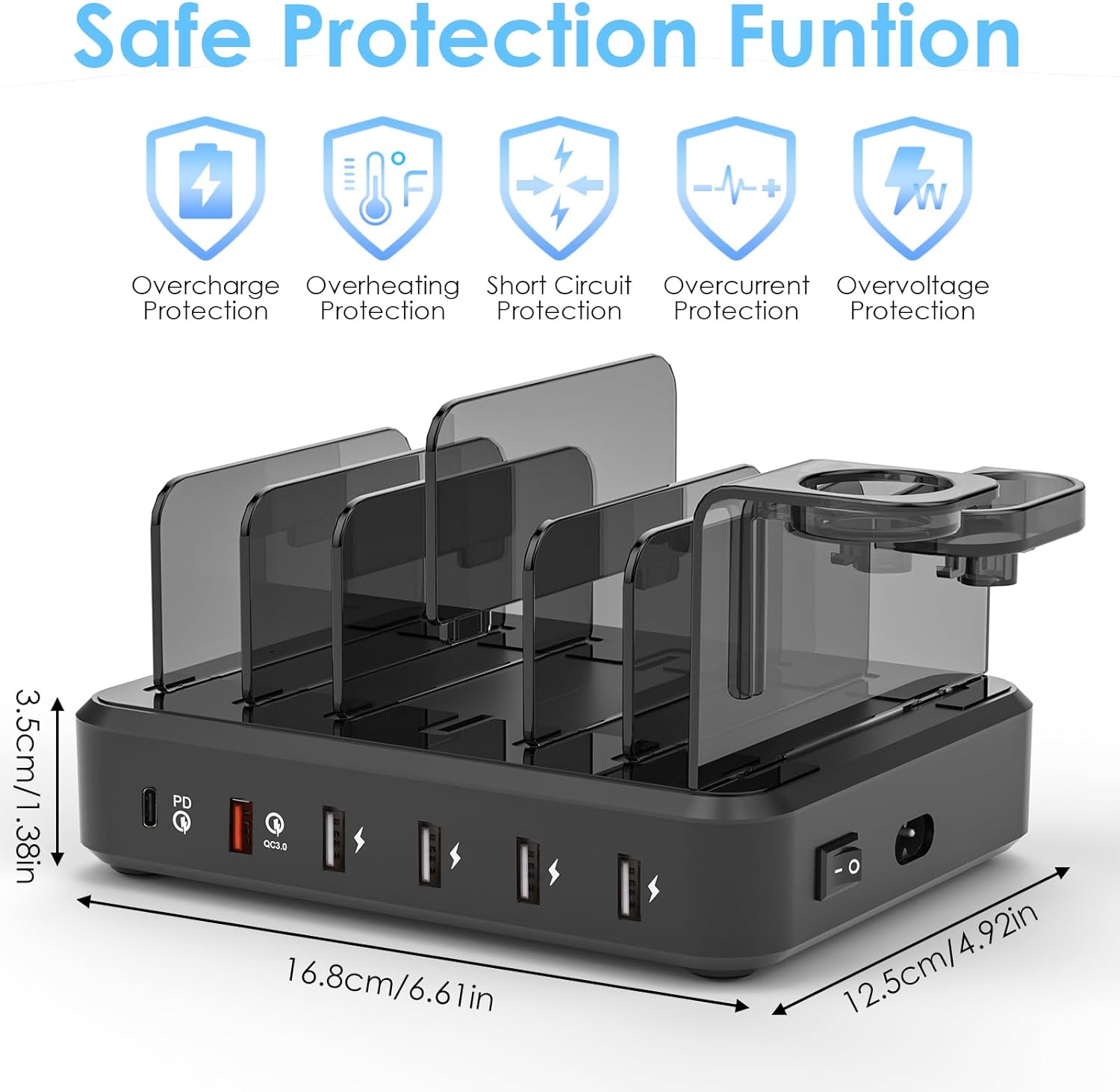 - Effizientes und bequemes Aufladen: Die Ladestation verfügt über 6 Anschlüsse, von denen einer über eine 20W PD-Schnellladefunktion verfügt. Mit der 20W PD-Ladung kann Ihr Handy in 30 Minuten bis zu 50% aufgeladen werden, was bis zu 3-mal schneller