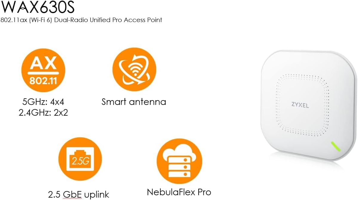 - ZYXEL WAX630S SINGLE PACK 802.11AX (WIFI6) 4X4 SMART ANTENNA EXCLUDE POWER ADAPTOR. 1 YEAR NCC PRO PACK LICENSE BUNDLED MULTIGIG PORT